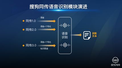 这是搜狗同传语音识别演进模块,搜狗 1.0 时,输入仅是语音,2.0 开始做语音+个性化,以及说话人的语境背景输入;3.0 加入了知识图谱,把语音、视觉等信息作为语音识别的输入。现在,业内技术普遍介于1.0 和 2.0 之间,而搜狗依靠图谱方式,已经率先进入3.0 时代。