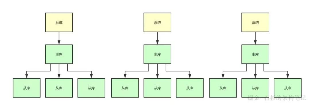 比如你得分 3 个主库,承载每秒 2000 的写入请求,然后每个主库挂 3 个从库,一共 9 个从库承载每秒 1.8 万的读请求。