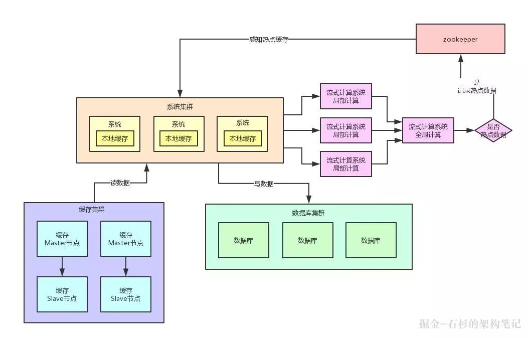 一旦在实时数据访问次数统计的过程中,比如发现 1 秒之内,某条数据突然访问次数超过了 1000,就直接立马把这条数据判定为是热点数据,可以将这个发现出来的热点数据写入比如 Zookeeper 中。