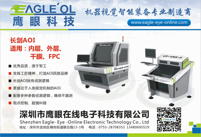 进入PCB行业以来,鹰眼科技相继推出长剑II-750,长剑II-450,长剑II-750S等一系列AOI设备,成为PCB专用设备领域的一匹黑马。独到的检测逻辑、全面的光学设计,使长剑AOI不仅能检测内、外层板的缺陷,而且可以兼容干、湿膜的检测。随着PCB行业工艺制程的升级迭代,鹰眼科技紧贴行业需求,陆续推出HDI(High Density Interconnector 高密度互联)板专用AOI、FPC(FlexiblePrinted Circuit 柔性电路板)专用AOI、大尺寸大台面AOI、树脂塞孔专用AOI等系列AOI,成为线路板企业领先行业的秘密武器。鹰眼科技,以工匠精神打造军工品质,立志成为AOI领域的民族品牌!