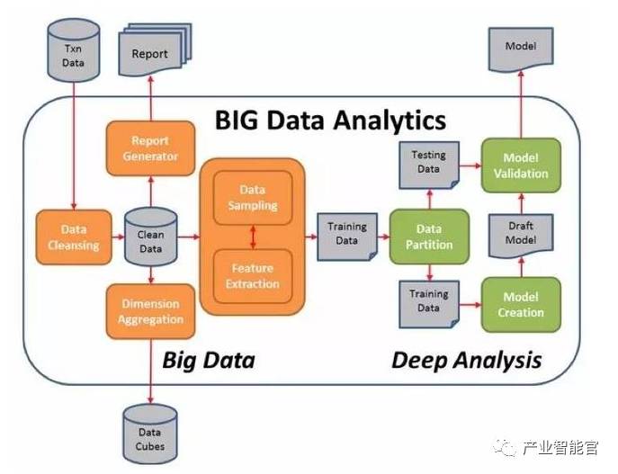 机器学习与常见的数据分析稍有不同,通常需要多个阶段经历多次迭代才能得到满意的结果。下图是深度分析的架构图: