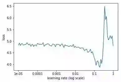 这个方法在论文中是用来估计网络允许的最小学习率和最大学习率,我们也可以用来找我们的最优初始学习率,方法非常简单。首先我们设置一个非常小的初始学习率,比如1e-5,然后在每个batch之后都更新网络,同时增加学习率,统计每个batch计算出的loss。最后我们可以描绘出学习的变化曲线和loss的变化曲线,从中就能够发现最好的学习率。