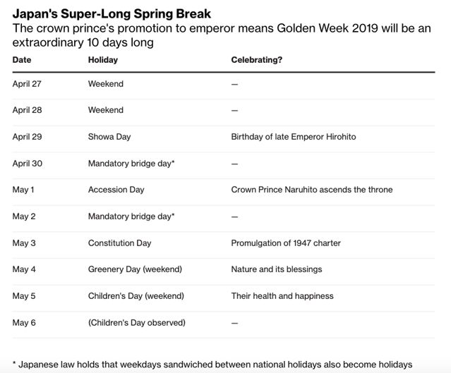 日本超长的春季假期:日本皇太子的天皇即位仪式意味着2019年黄金周将是史无前例的连休十天(日本法律规定,两个法定节日之间的工作日也是法定假日)