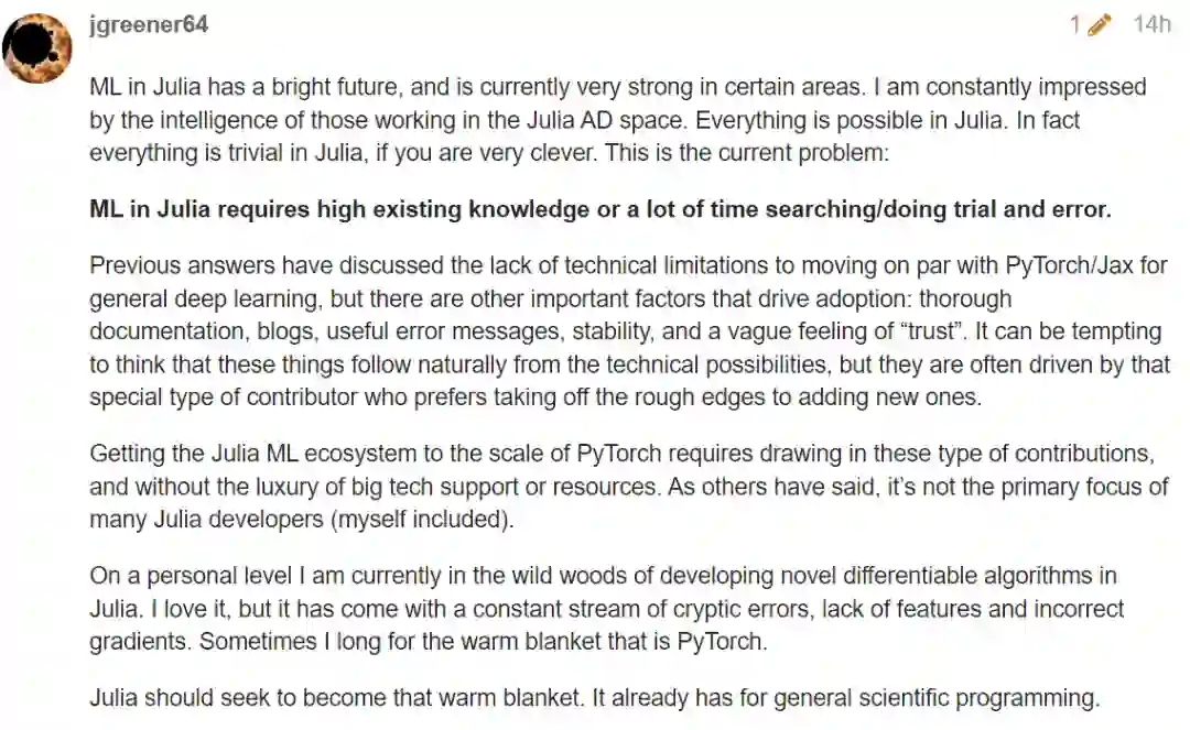 网友 @jgreener64 表示:「Julia 中的 ML 在某些领域应用非常强大,Julia 一切皆有可能。Julia 面临的问题是:Julia 中的 ML 需要大量现有知识或大量时间搜索 / 反复试验。在个人层面上,我目前正在用 Julia 开发新颖的可微分算法。」