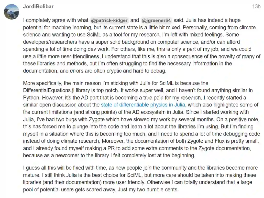 来自乌得勒支大学的 JordiBolibar 认为,「 Julia 确实在机器学习方面拥有巨大的潜力,但它目前的状态有点喜忧参半。更具体地说,我在 SciML 中坚持使用 Julia 的主要原因是,DifferentialEquations.jl 库工作得非常好,但在 Python 中没有发现任何类似的东西。然而,对于我的研究来说,真正痛苦的是 AD 部分。自从我开始使用 Julia ,我在 Zygote 中遇到了两个错误,这使我的工作速度减慢了几个月。但我仍然认为 Julia 是 SciML 的最佳选择,但这些库(及其文档)应该优化的更加用户友好。」
