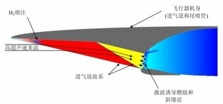 当可燃混合气流动速度大于爆震波的传播速度时,正爆震波无法稳定,通过引入斜劈或者中心锥体,可以使形成斜爆震波并稳定下来,这就是斜爆震发动机(ODE)的概念(图36)。其工作时在飞行器的前缘下方喷注燃料,来流空气与燃料经压缩进入燃烧室后产生斜激波诱导的爆震燃烧。该形式能够缩短燃烧室长度,减轻发动机重量,以CJ斜爆震燃烧模式组织燃烧时熵增和总压损失都较小。ODE的单位推力以及单位燃油消耗率与传统的冲压发动机性能相当,在高飞行马赫数条件下,ODE性能更优(尤其是马赫数大于8时)。由于对试验条件要求比较苛刻极高,ODE试验方面的报道较少,以林志勇等所采用的连续式高静温预混超声速加热器实验方案是其中的代表[13]。中科研力学所等单位有开展相关计算[14]。