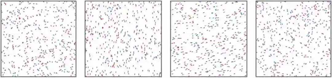 研究者还模拟了红蓝两组以恒定速度移动且彼此之间具有不同关系的智能体。图 1 中,红蓝智能体随机移动。到了图 2,红蓝智能体往同一方向飞行,自发地打破了对称性并表现出群集行为。图 3 中,当红蓝智能体相向移动时,出现了类似的反群集相。到了图 4,红蓝智能体开始了原地旋转,形成另一种自发对称性破缺的情况。