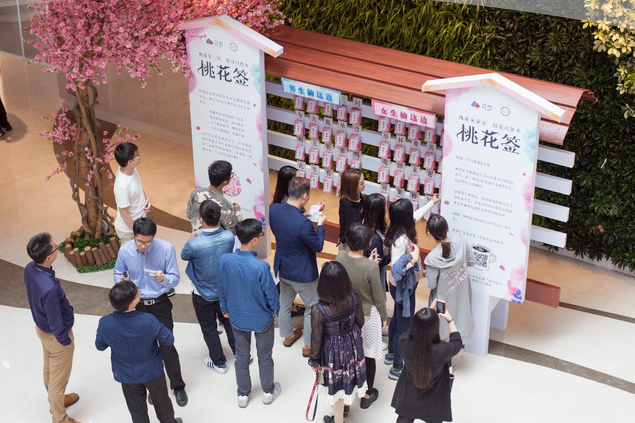 “猜到大家会喜欢桃花签,但没想到这么受欢迎。”一位现场的工作人员说,“我们每天放男女各1000个桃花签。傍晚时,女生抽的那边就被一扫而空,而男生抽的还剩一半左右。也许是面对爱情,女生更主动吧”。