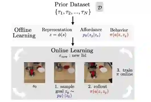 给定一个展示各种环境可供性的先验数据集,VAL在三个离线步骤中消化这些信息:用于处理高维真实世界数据的表示学习,在未知环境中实现自监督练习的可供性学习,用于获得高性能的初始策略以加快在线学习效率的行为学习。