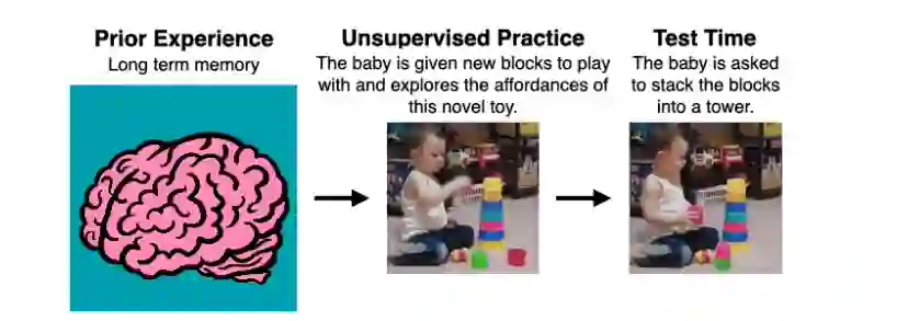 为此,我们面临几项挑战。当机器人被置于一个新环境时,它必须能够利用其先前的知识来思考环境可能提供的潜在有用行为。然后,机器人必须能够实际地练习这些行为。为了在新的环境中改进自己,机器人必须能够在没有外部奖励的情况下以某种方式评估自己的成功。