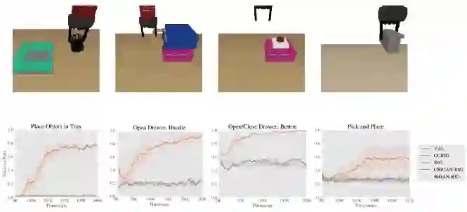 为了进一步分析,我们在具有视觉和动态变化的程序生成的多任务环境中运行 VAL。场景中的对象以及它们的颜色和位置都是随机的。媒介可以用把手打开抽屉、抓取物体并移动它们、按按钮打开隔间等等。