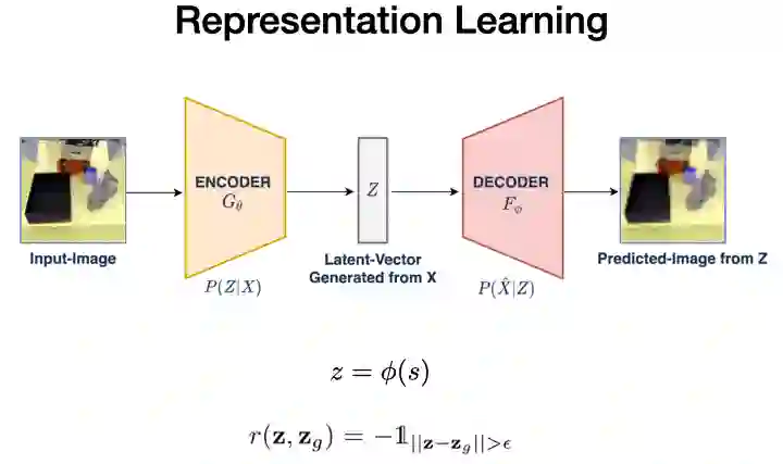 在这个潜在空间的距离是有意义的,为我们自我评价成功的关键机制铺平了道路。给定当前图像s和目标图像g,我们将它们编码进潜在空间,并设定它们可以获得奖励的距离阈值。