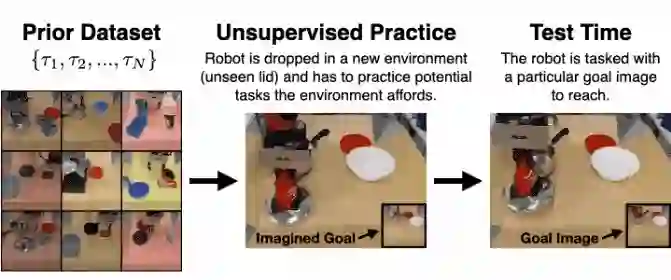 如下图所示。在左侧,我们先收集了由机器人完成各种任务的视频,比如打开和关闭抽屉、抓取和移动物体。在右侧,我们放置了一个机器人从未见过的盖子。机器人被给予一小段时间来熟悉这个新物体,之后它将获得一个目标图像,并负责使场景匹配这个图像。机器人如何在没有任何外部监督的情况下迅速学会操控环境并抓住盖子?