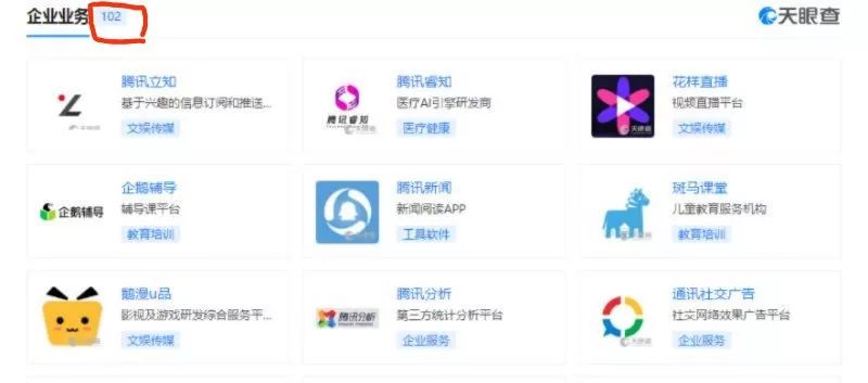 当前在天眼查中显示,腾讯的企业业务包括102个项目。一翻盘点后,其实许多腾讯经营过的项目并未在内。