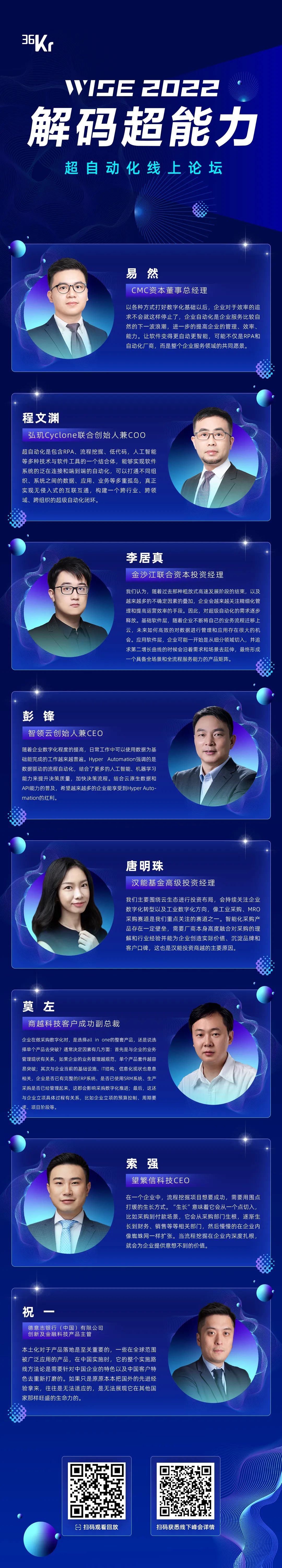 其中,7月13日线上论坛已经圆满结束,我们邀请到了弘玑Cyclone、智领云、商越科技、望繁信、CMC资本、金沙江联合资本、汉能基金、德意志银行(中国)有限公司等关注超自动化领域的甲乙方企业、投资机构,以对谈的形式与大家共话“超能力”。