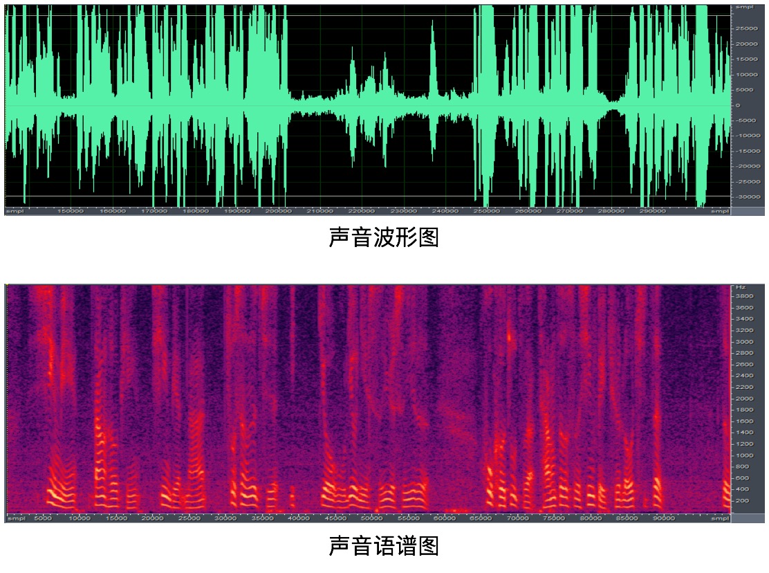 声纹不如图像那样直观展现,在实际分析中,可通过波形图和语谱图进行展现,如下所示: