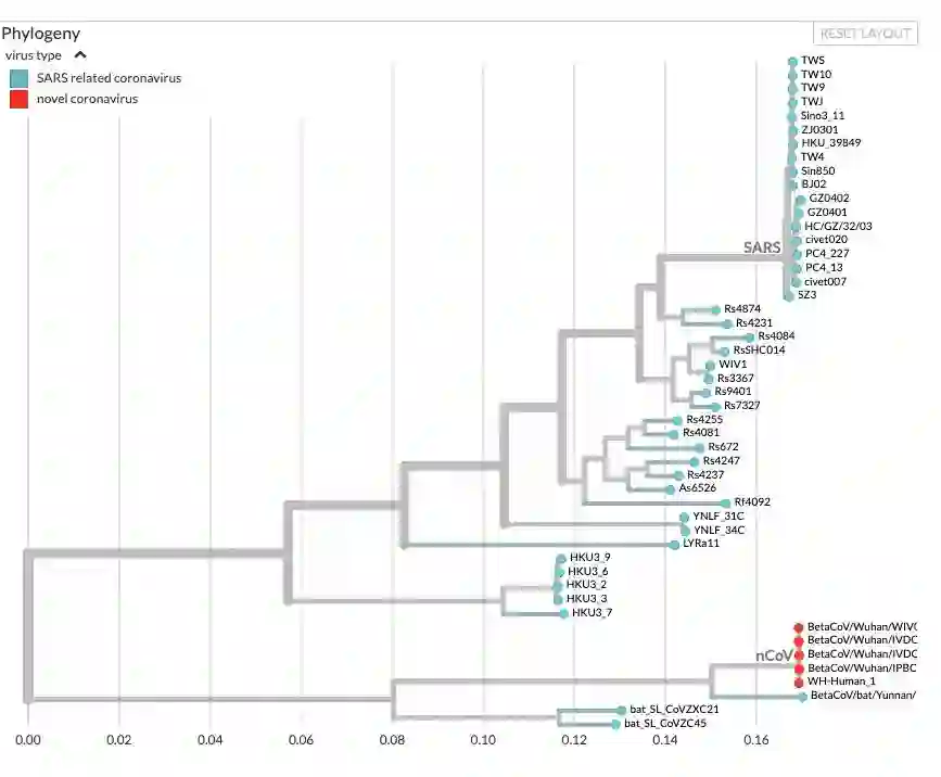 根据Bedford的分析,石正丽团队强调的蝙蝠冠状病毒序列,被称为RaTG13,与2019-nCoV有近1100个核苷酸的不同。在他共同创建的网站nextstrain.org上,Bedford创建了冠状病毒家谱(见下图),其中包括蝙蝠、果子狸、SARS和2019-nCoV序列。(这些树是交互式的——通过在它们上面拖动鼠标,很容易看出序列之间的异同。)