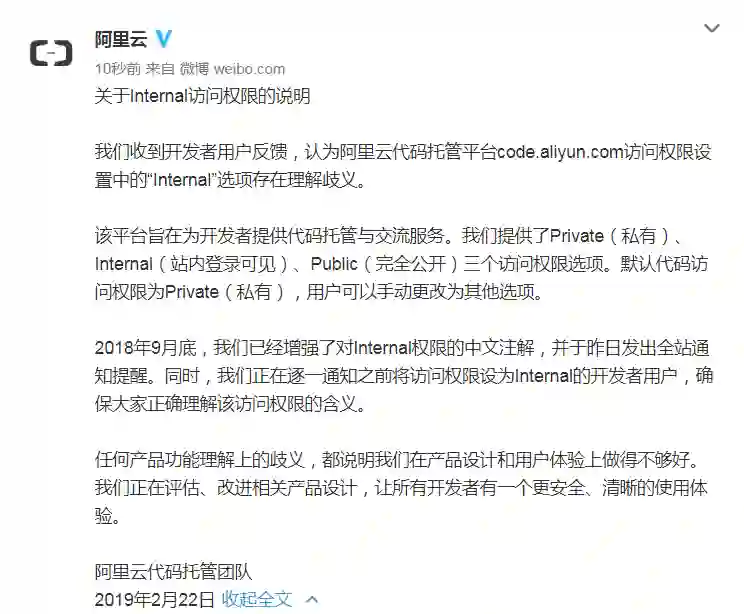 阿里云方面表示,2018 年 9 月底,阿里云曾增强对 Internal 权限的中文注解,并于近日发出全站通知提醒。同时,阿里云正在逐一通知之前将访问权限设为 Internal 的开发者用户,确保大家正确理解该访问权限的含义,并将继续评估、改进相关产品设计,让所有开发者有一个更安全、清晰的使用体验。