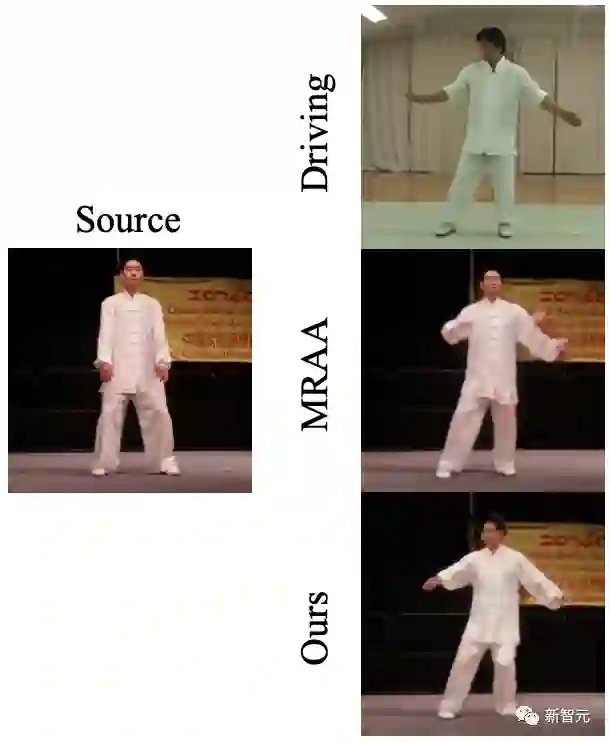 太极拳视频中人物的动作幅度相对较大,这导致了驱动视频(Driving)和源图像(Source)之间可能存在着较大的姿态差异(a large pose gap),如果不能良好的建立驱动视频与源图像任务动作姿态之间的关系,则会导致生成的视频「跟不上」驱动视频,在效果上体现为生成视频中人物关键点的不匹配。