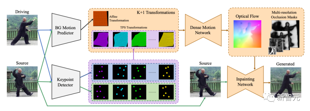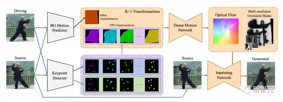TPSM模型之所有能够「跟得上」(良好的匹配源图像与驱动视频之间的关键点),得益于其最大的创新点,即提出了一个名为TPSM( thin-plate spline motion)的动作估计方法,该方法可以产生更加灵活的光流,将源图像的feature-map和驱动视频的feature-domain关联起来(使用warp操作)。