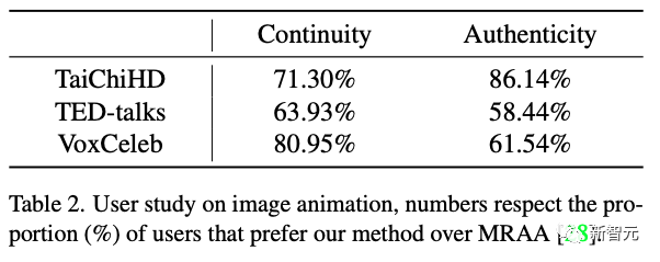 表 2体现了全身太极拳(TaiChiHD)、半身TED演讲(TED-talks)及明星访谈特写(VoxCeleb)三个不同的数据集上,人类观察员在连贯性(Continuity)及真实性(Authenticity)两个指标中对于TPSM的赞同程度。