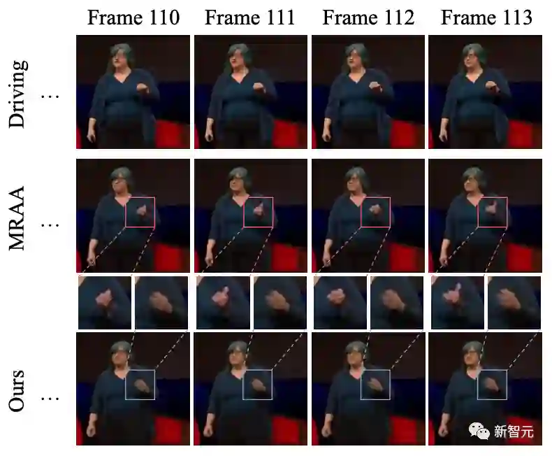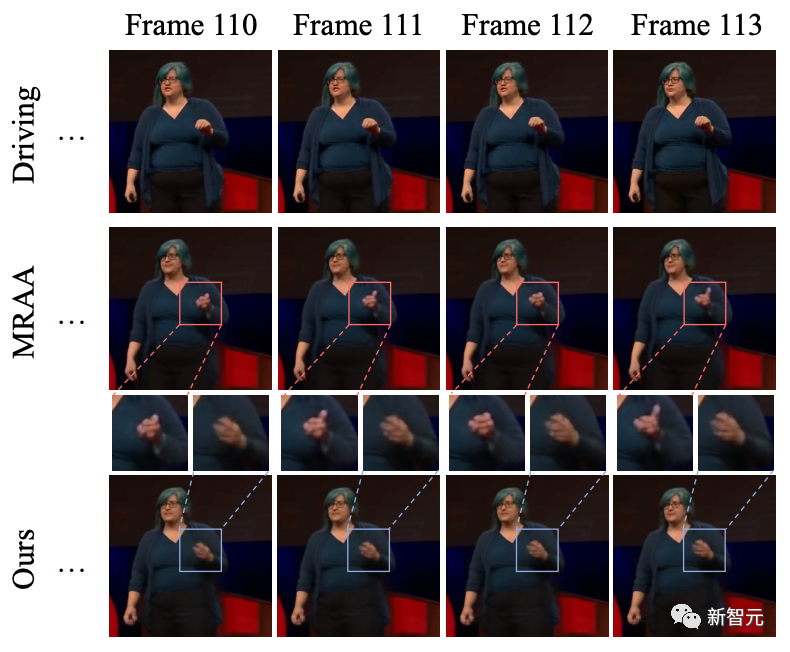 例如下图MRAA生成的视频中,人物的一只手掌未能与手臂相连,显然此时MRAA模型未能将源图像中该只手掌的关键点位置与驱动视频中相应关键点成功匹配,但TPSM却较好的做好了这一点。