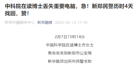 近年来发生不少类似的案例,无数丢失电脑的硕博生们,最终大部分都被寻回,不得不说,能顺利毕业的安全感都是民警给的