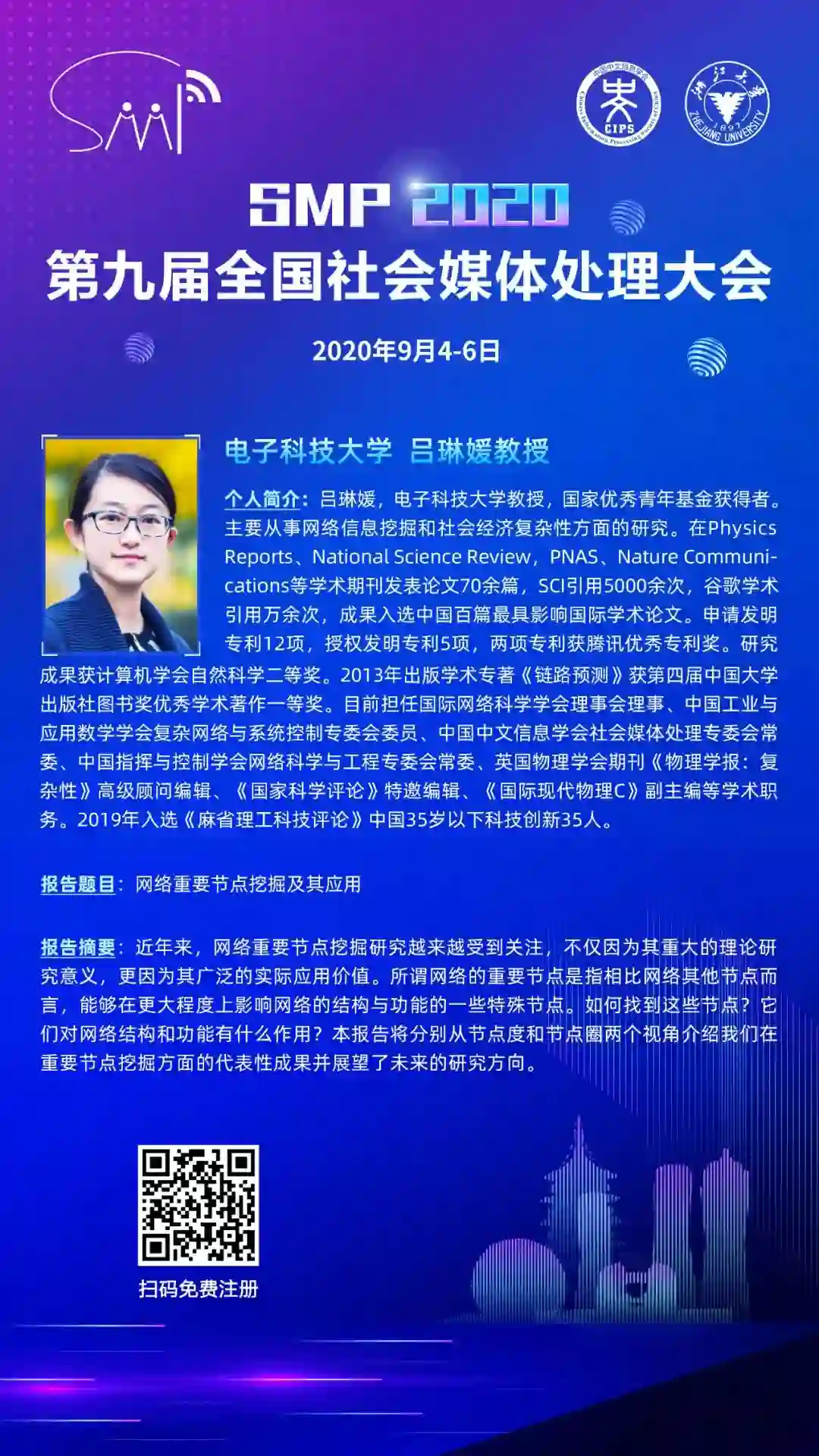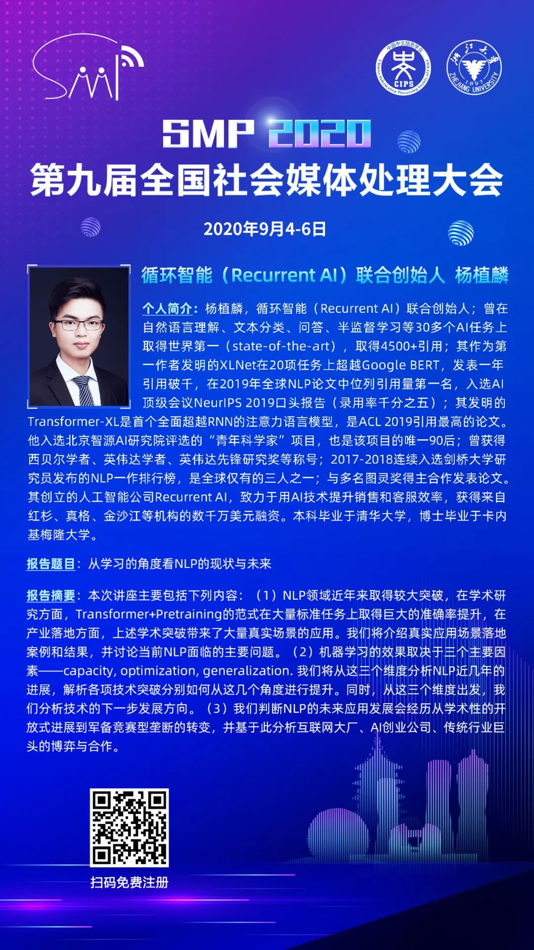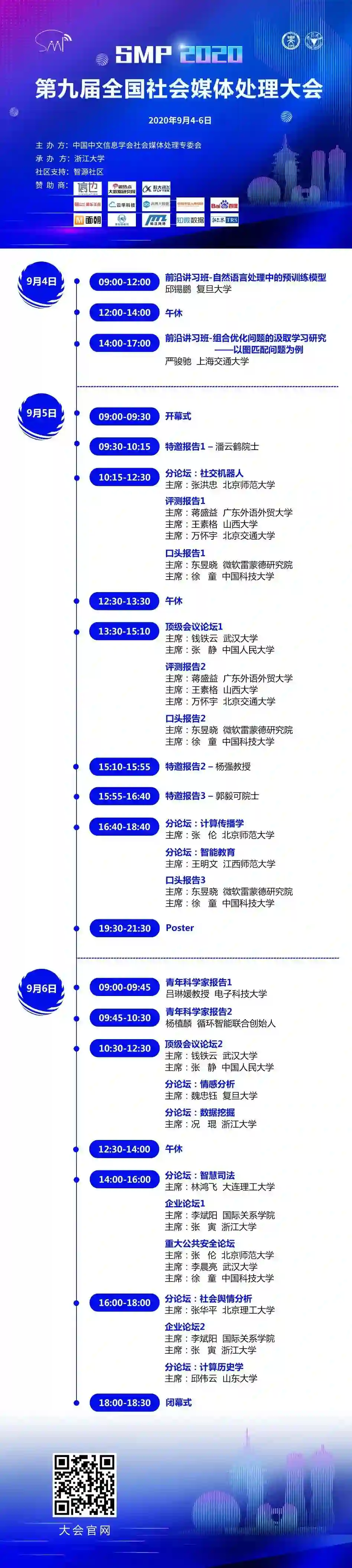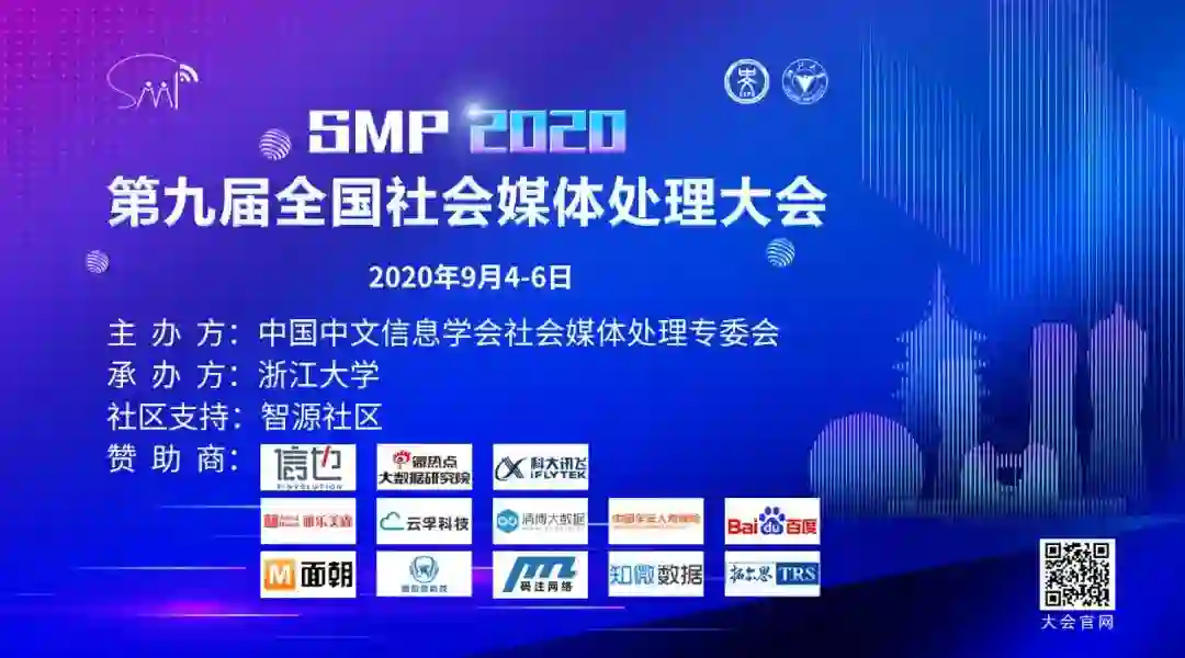 第九届全国社会媒体处理大会(SMP 2020)由中国中文信息学会社会媒体处理专委会主办,浙江大学承办,将于 2020 年 9 月 4 日至 9 月 6 日线上召开。大会正在开放注册中,了解「报名详情」请参见文末。