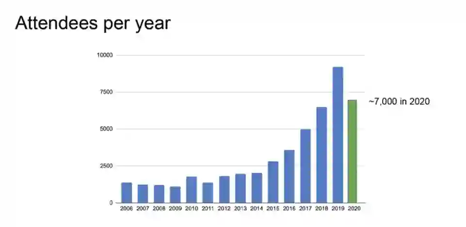 从2006开始到2014年CVPR投稿量一直处于“稳定”状态,2014年到2019年之前则处于“线性”增长状态,但是在2020年7000篇左右的投稿量是似乎又将数量拉到了2018年的水平,是否2021年会继续下降,还需继续观察。