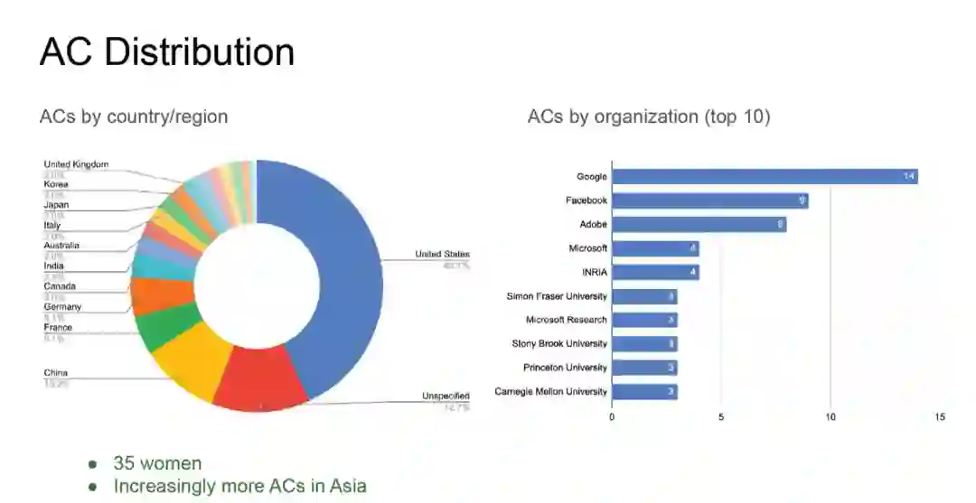 领域主席的分布,刘策特别点出了本届领域主席有35位女士,亚洲领域主席的数量在不断上升。从比例来看,美国仍然是大头,占比43.1%,中国排名在Unspecified之后为第三。从机构来看,谷歌14位的数量稳居老大,Facebook、Adobe、微软都在前五之列。