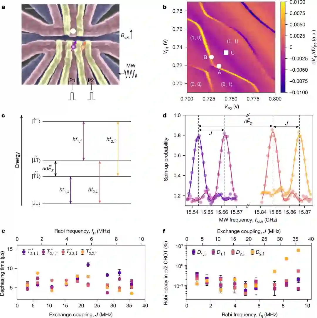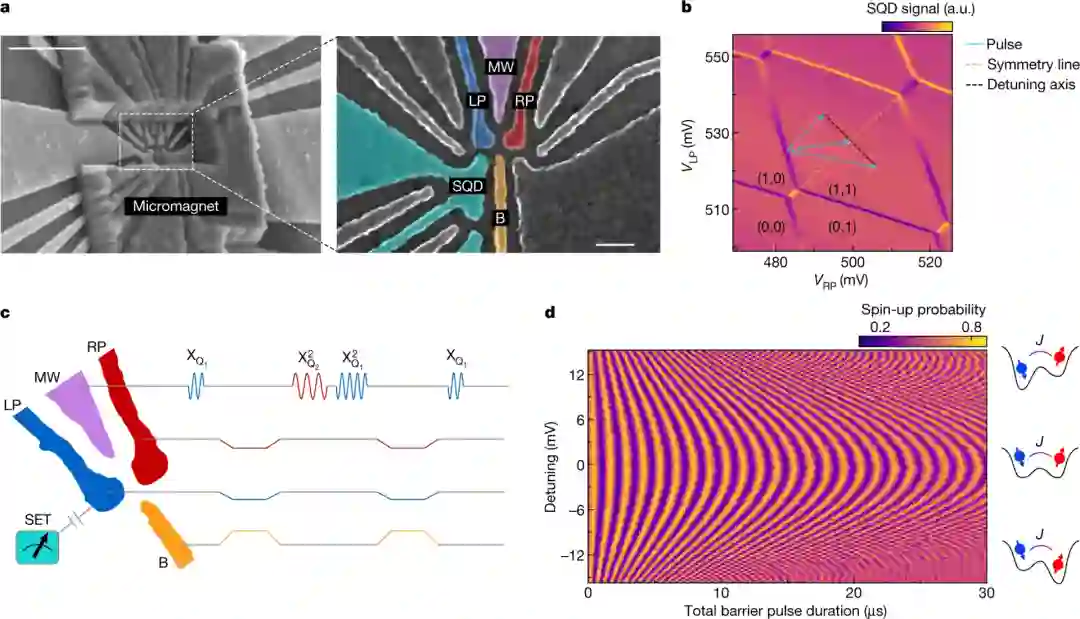 作者使用由硅和硅锗合金堆栈形成的材料创造了一个双量子比特系统,其中量子信息被编码在限制于量子点的电子自旋中。