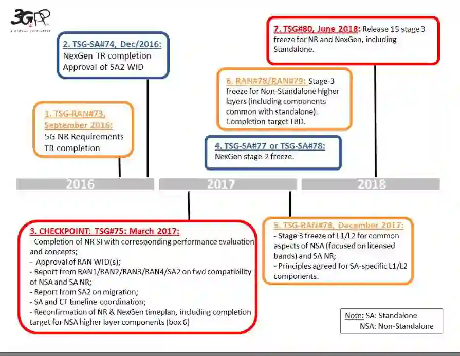图丨 3GPP 5G 标准制定进度变化,2017 年 12 月 20 日召开的工作会议确立 Release 15 为第一版 NSA 5G 标准。
