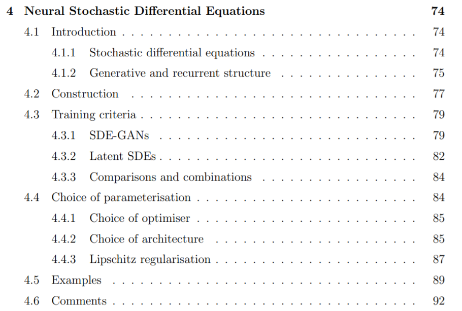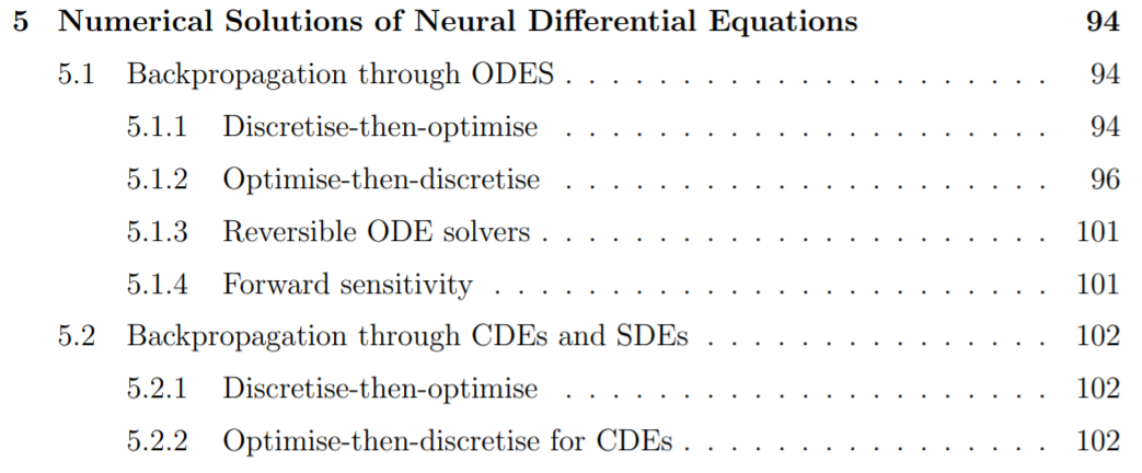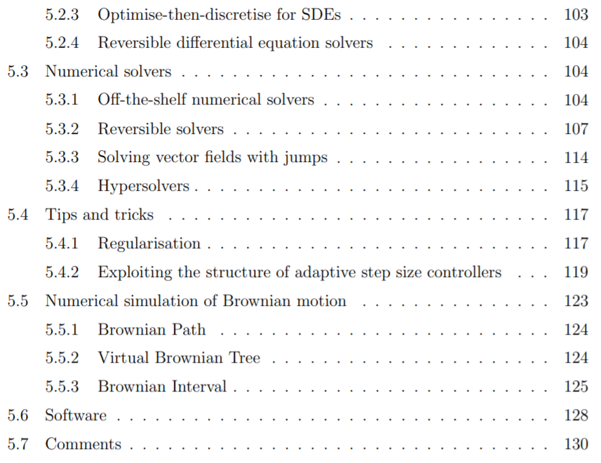 本章共分为 7 个小节,主要内容包括通过 ODES 进行反向传播、通过 CDE 和 SDE 进行反向传播、数值求解器、实用技巧、布朗运动的数值模拟、应用软件以及评论。