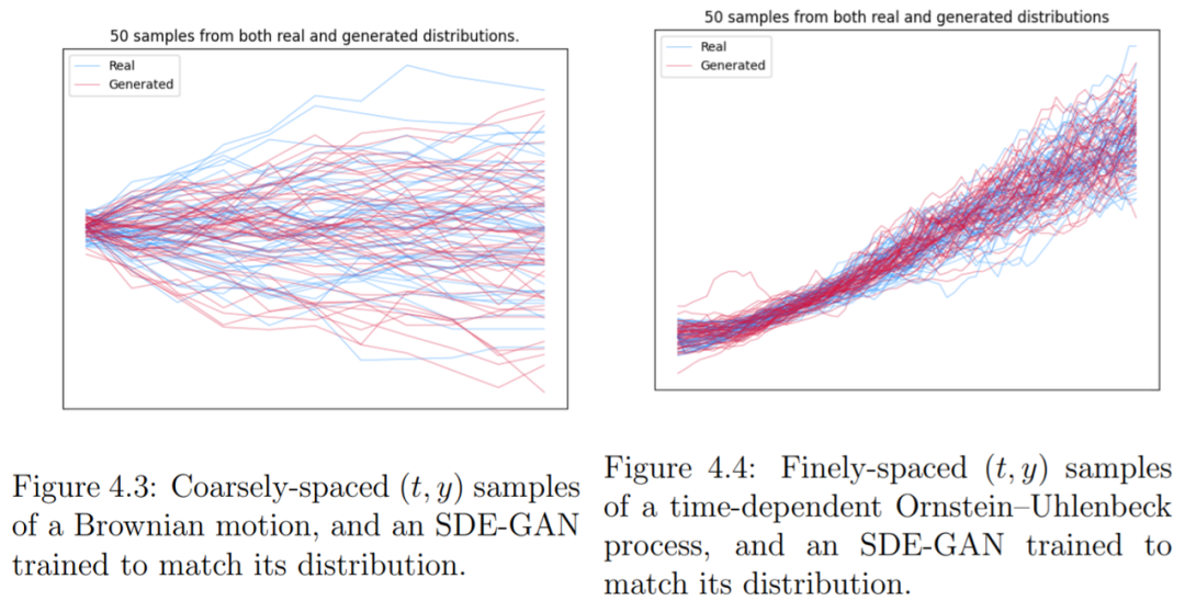 布朗运动作为最简单的示例,考虑(单变量)布朗运动样本的数据集,初始条件为 Uniform[-1, 1]。数据集的每个元素都是沿单个布朗样本路径的时间序列观察到的。研究者训练了一个小的 SDE-GAN 来匹配初始条件的分布和时间演化样本的分布。