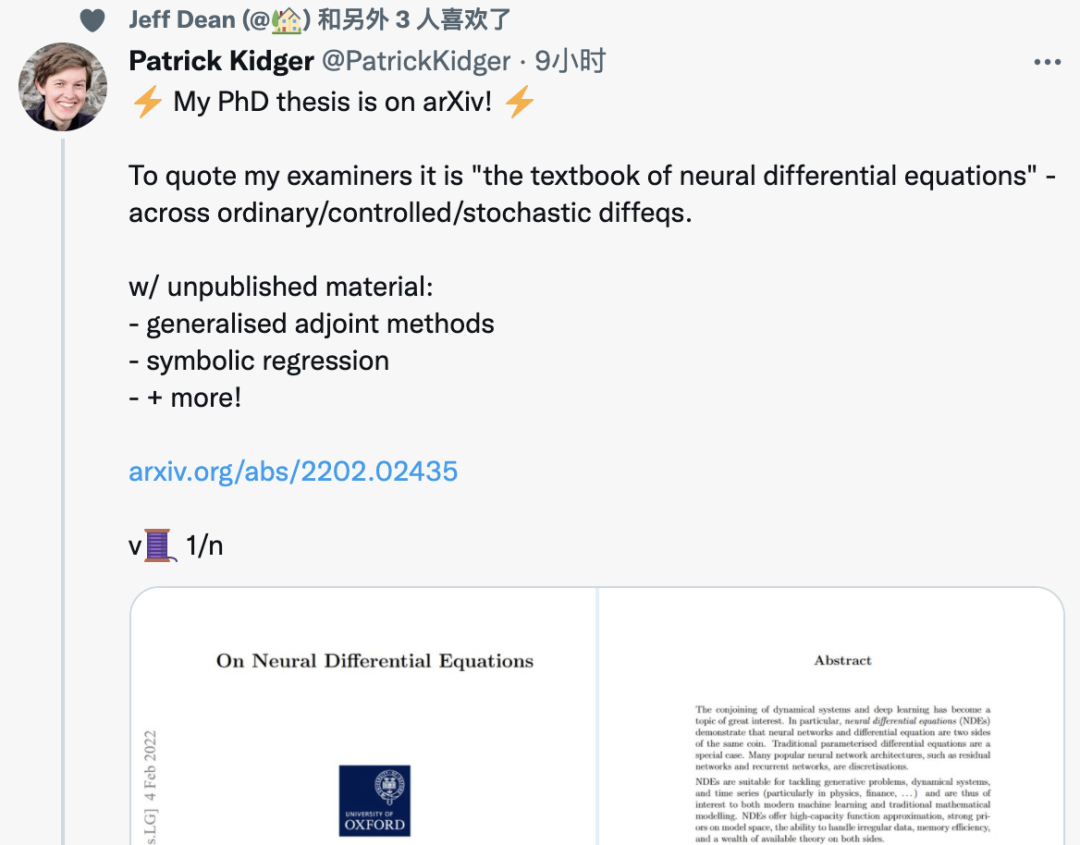 近日,一篇专门探讨神经微分方程的博士论文《 On Neural Differential Equations》吸引了领域内研究者的注意,谷歌 AI 负责人、知名学者 Jeff Dean 也点赞推荐。这篇论文的 examiner 甚至褒赞它为「神经微分方程的教科书」。