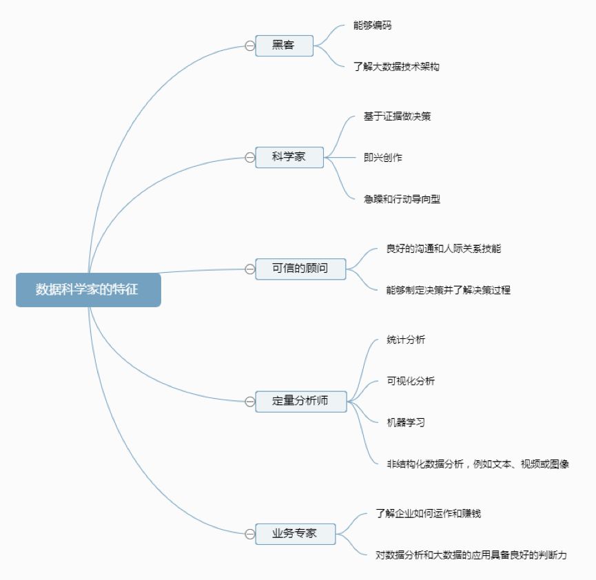 进行大数据分析的科学家可能会具备的特征有:基于证据做决策、即兴创作、急躁以及自己动手的宽慰感。在大数据工作的早期阶段,这些技能很重要。在这一阶段中,数据科学家必须执行一些开创性工作,而在后期,这些工作可能会通过软件轻松地完成。科学家也可能是快速学习者,能迅速地吸收和掌握新技术。