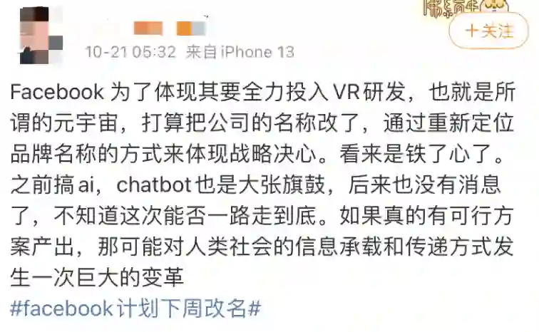 了Facebook计划在下周更改公司名称,专注构建「元宇宙」,引发网友热议。