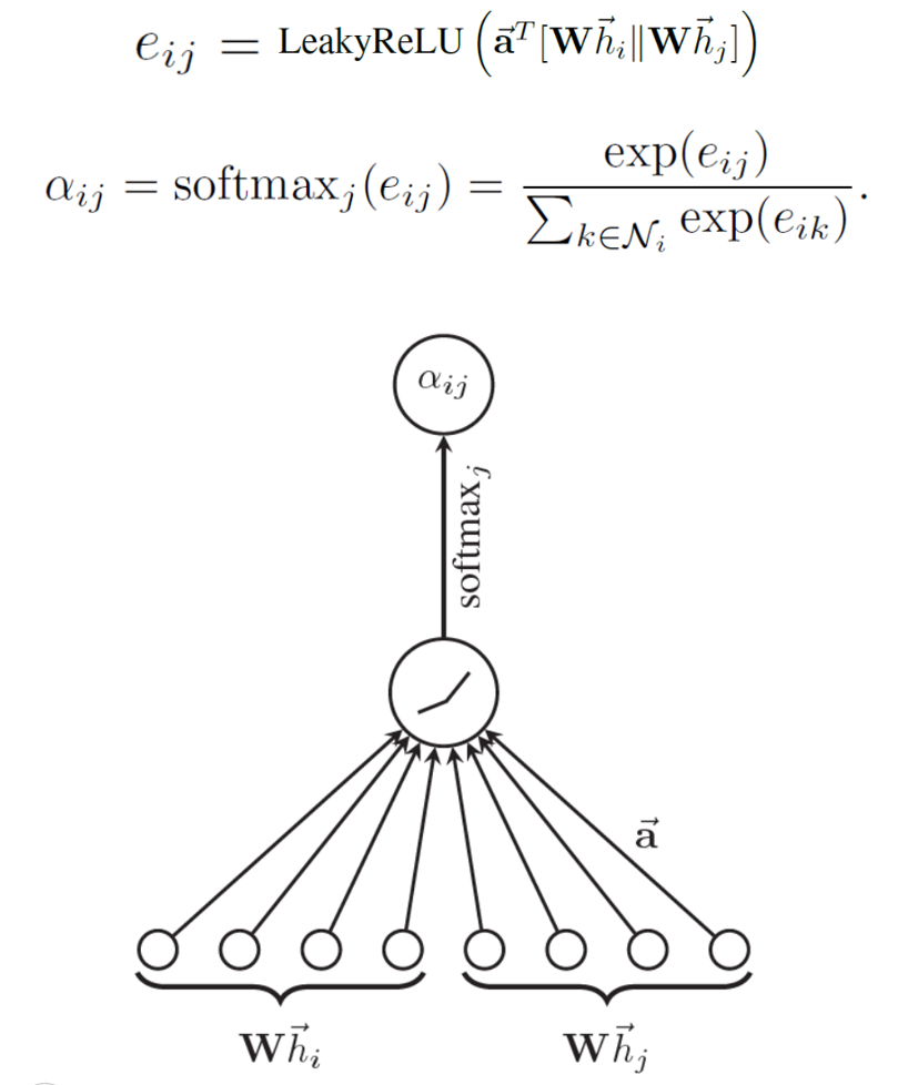 为了获得足够的表达能力将输入特征转化为更高层次的特征,至少需要一个可学习的线性变换。GAT中,每层使用一个可训练的共享的线性变换矩阵 和权重向量 。