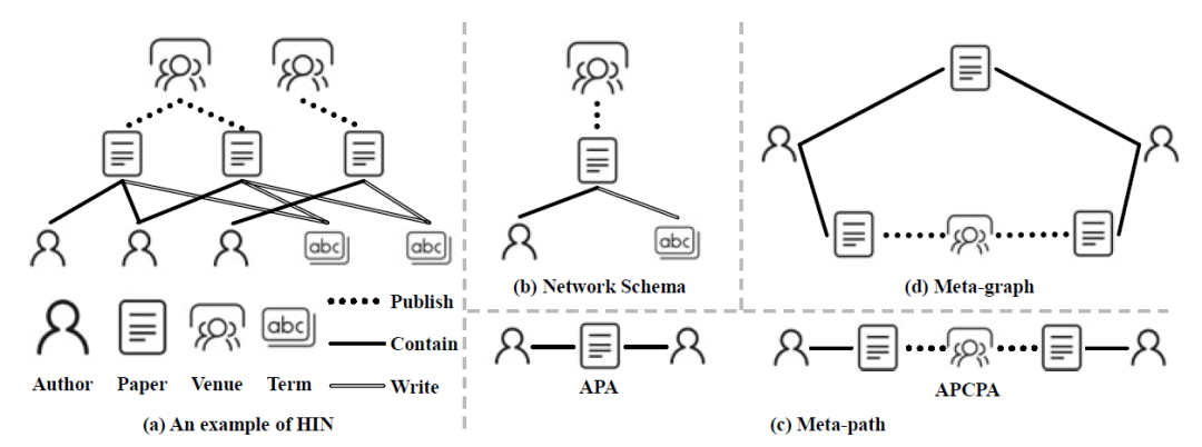 给定一个异质图 ,一条Meta-path 可以被定义为 , 表示特定类型的节点和边,这种新的关系 可以定义为