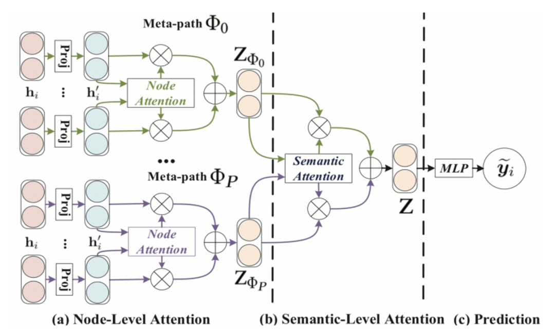 在这部分,我们介绍HAN,它通过利用节点级注意力和语义级注意力来学习节点和元路径的重要性,为异构图扩展了GCN。因此,HAN可以捕获异构背后的复杂结构和丰富的语义。
