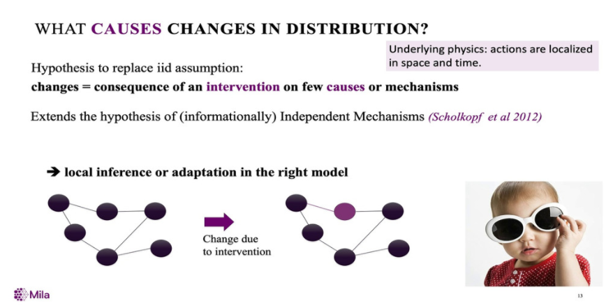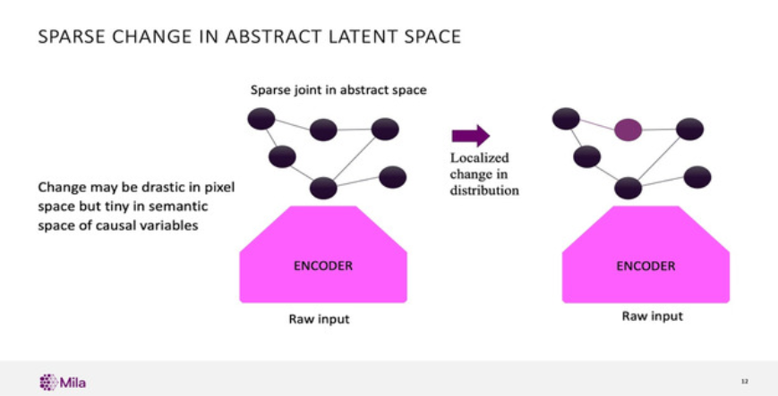 其实,在抽象空间中,更改是局部化的,可能只需要修改一个变量、一个条件或一个因素。因此,学习如何适应修改后的分布变得容易得多,如果以正确的方式表示信息,就可以快速传输。