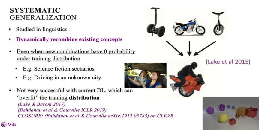 这些概念可以是口头的,也可以是视觉的,如上图所示,不同类型的车辆组合在一起形成了一个新的概念,这种概念的重组能够解释我们从未见到过的观测结果,即使是在训练分布概率为零的条件下也可以。