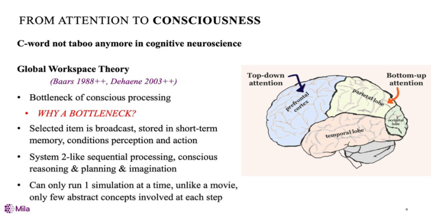 上面是神经科学中关于意识的几个理论的核心,尤其是全局工作空间理论,大多数是由Baars提出,涉及了意识过程的瓶颈问题。