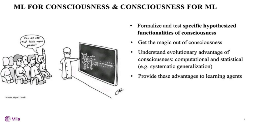 所以现在是机器学习考虑这些将意识加入模型的时候了。另一方面,这对意识的研究也有好处,能够在测试意识的特定假设功能以及正式化方面提供帮助,也能够让我们从意识中获得一些魔力,并理解意识的进化优势、计算和统计优势。