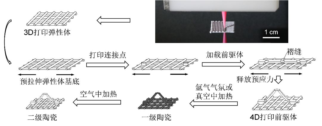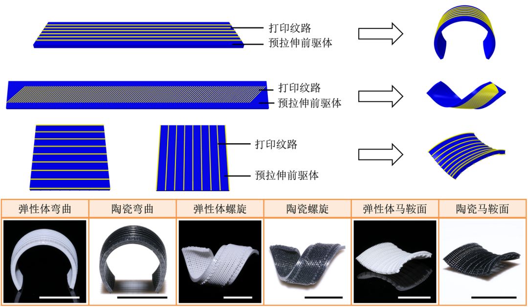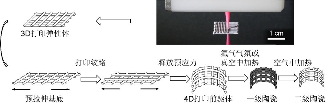 在方法二中,陶瓷前驱体墨水按照设计好的纹路被打印在预拉伸的陶瓷前驱体上,然后预应力被释放时,就会发生4D变形。