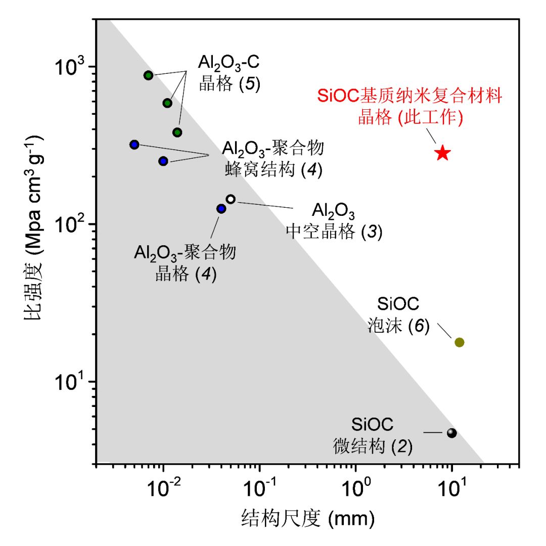 此方法得到的陶瓷结构具有很高的比强度(strength-to-density ratio),并且可以兼具高强度和大尺度 (strength-scalability synergy)。