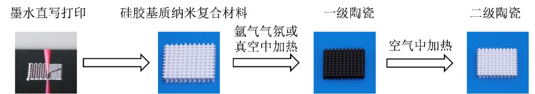 在此次研究中,他们先实现了3D打印陶瓷。他们采用了墨水直写打印(Direct ink writing)这种成本较为低廉的打印方式,用纳米复合材料作为墨水,构建弹性体3D结构,然后在氩气或真空中进行热处理,得到一级陶瓷,然后在空气中进行热处理,进而得到二级陶瓷。开发这两级陶瓷可以丰富材料的外观,譬如这里一级陶瓷是黑色的,而二级陶瓷是白色的。