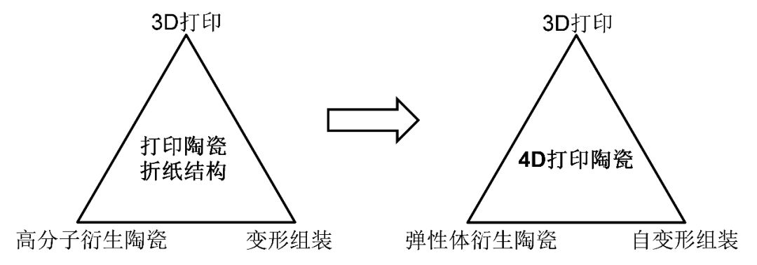 4D打印一般是指在3D打印的基础上增加一个时间维度,使得在一定刺激(譬如热,水,磁场,电流,紫外线等)下,3D打印物体的形状和功能随着时间发生可编程变化。4D打印技术之前大都应用在聚合物材料中,包括水凝胶,形状记忆聚合物等。之前报道的可以3D打印的陶瓷前驱体材料通常较难发生自变形,限制了陶瓷4D打印的发展。