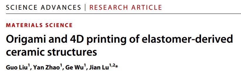 1. Guo LIU, Yan ZHAO,Ge WU, Jian LU, Origami and 4D printing of elastomer-derived ceramicstructures, Science Advances4, eaat0641(2018)