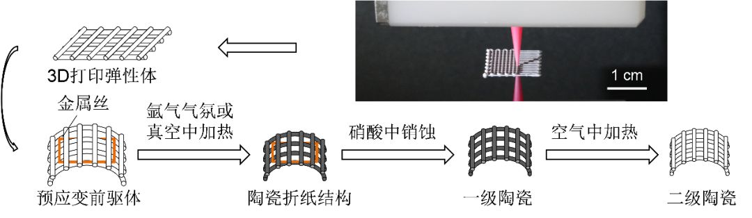 然后他们实现了陶瓷折纸结构。3D打印的弹性体结构可以在金属丝的辅助下折叠变形,经过热处理弹性体转化为陶瓷,然后金属丝可以被硝酸销蚀掉,最后只剩下陶瓷结构。